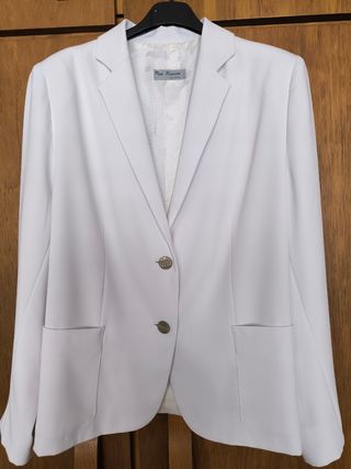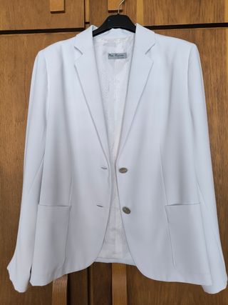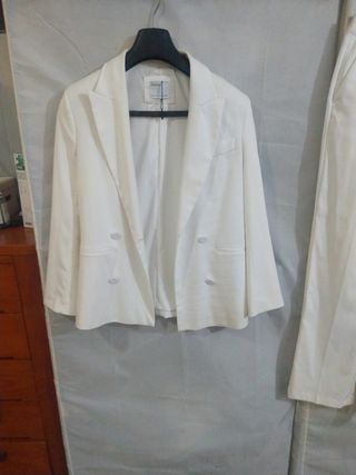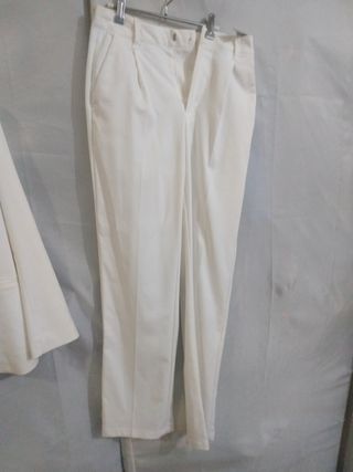 Elegante traje pantalón+ blazer blanco de la marca Paco Requena. Es de polièster y está en muy buen estado. Sólo se ha utilizado una vez. - Talla: 48 - Dos bolsillos de plastrón. - Botones plateados. Precio negociable
