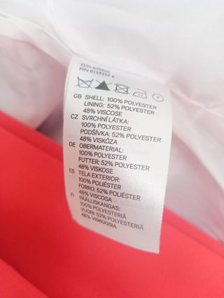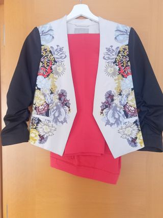 Chaqueta y pantalón de H&M, en colores rojo y blanco, talla S (EUR 36). La chaqueta tiene un diseño impecable y el pantalón es de corte clásico. - Tejido exterior: 100% poliéster. - Forro: 52% poliéster, 48% viscosa. - Hecho en China.