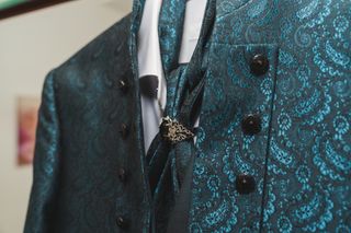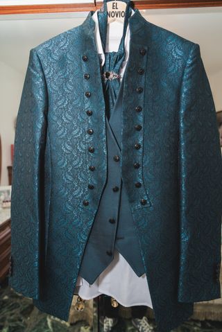 Elegante traje de novio color azul turquesa, ideal para una boda. - Tres piezas: chaqueta, chaleco y pantalón. - Incluyen zapatos talla 42. - Diseño con estampado floral. - Botones negros. - Incluye un pañuelo.