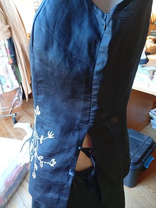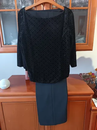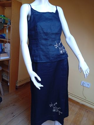 Precioso conjunto de dos piezas de Adolfo Domínguez, confeccionado en lino de color negre. Es una prenda elegante y sofisticada, ideal para ocasiones especiales. Falda cremallera lateral largo 78cm forrada cintura 40cm. Blusa de tirantes con cremallera lateral largo 50cm de axila a axila 44cm. Poco uso. - Detalle: Bordado floral en la falda y el top.