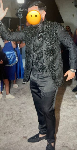 Elegante traje negro para boda, ideal para una ocasión especial. - Tres piezas: chaqueta, chaleco y pantalón y zapatos - Chaleco y chaqueta con pedrería. - Ajuste impecable.