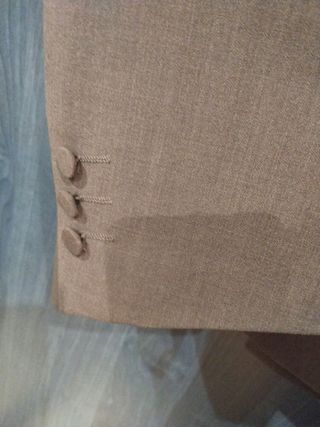 Elegante traje de dos piezas en tonos beige y marrón. Perfecto para ocasiones formales o de negocios. - Chaqueta con solapa de muesca. - Cierre de tres botones en la parte delantera. - Dos bolsillos con solapa en la parte delantera. - Puños con botones.