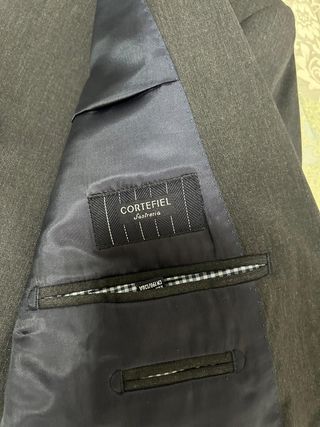 Traje de vestir en color gris de la marca Cortefiel. - Etiqueta interior con el nombre de la marca. - Bolsillo interior con detalle de tela a cuadros.
