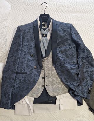 Magnífico traje de boda de la marca Petrelli. - Chaqueta con estampado floral. - Chaleco a juego con diseño. - Corbata y pañuelo. - Camisa blanca.