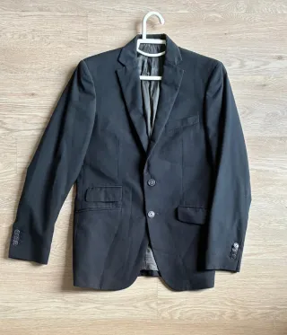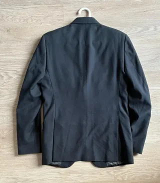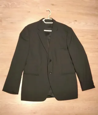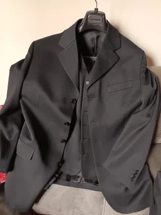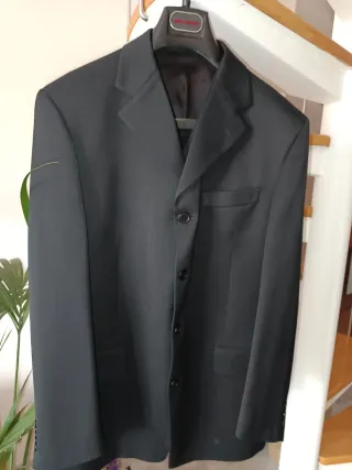 Traje conjunto de chaqueta y pantalón para hombre. Negro liso. Americana con bolsillos interiores. Buenos acabados. Medidas americana: ancho cintura 50 cm Largo manga 65 cm ancho hombros 45 cm Medidas pantalón: ancho cintura 50 cm largo pantalón 110 cm Composición: 55% poliéster, 43% lana, 2% elastano.