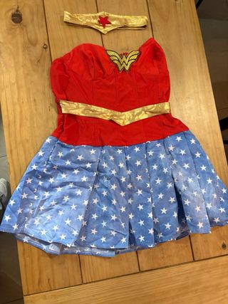 Disfraz de Super Woman con diadema y capa - Cuerpo rojo con detalles dorados. - Falda azul con estrellas blancas. - Cinturón dorado.