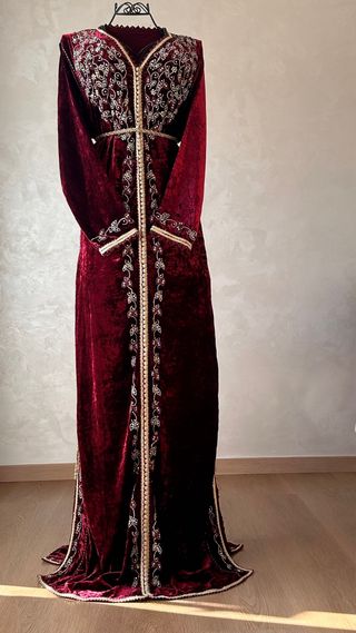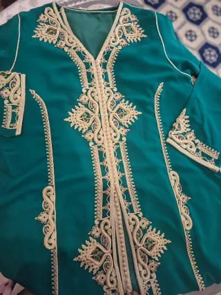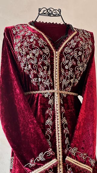 Elegante tekchita de estilo marroquí, perfecta para ocasiones especiales. Presenta un diseño intrincado y detalles de pedrería. - Adornada con bordados dorados. - Escote en V con adornos.