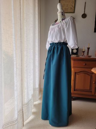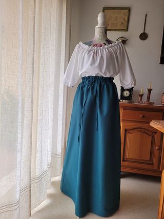 Traje medieval o renacentista de campesina,compuesto por blusa de algodón blanca y falda de tergal verde. Medidas de la blusa: contorno de pecho 136 cm,es bastante amplia, equivalente a una talla M/L. Medidas de la falda: contorno de cintura 110 cm ( con el cordón sin ajustar), largo 109 cm, la falda puede valer para cualquier talla,ya que se ajusta a la cintura con el cordón.
