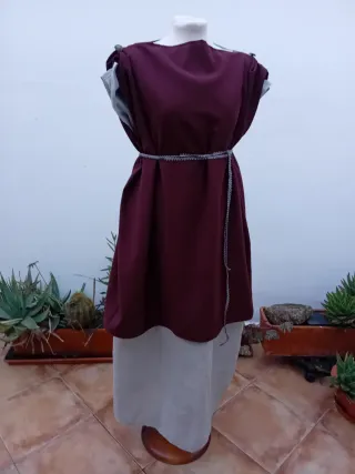 Traje de romana sin estrenar, confección artesanal, compuesto de túnica interior en tejido de lino tono gris y túnica exterior en tejido grosor medio de extraordinaria calidad burdeos. Botón joya en hombro, y diferentes cordones para ajustar adaptar a tallas M y superiores a L. Medidas: tunica interior, contorno total de 144 cm y 130 cm de largo y túnica exterior contorno total 150 cm y largo de 86 cm. Collar se vende aparte.