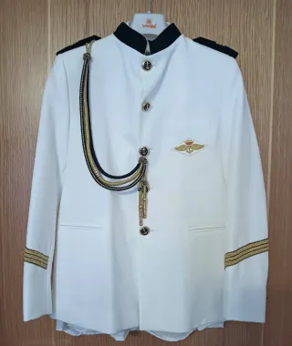 Traje formal para ceremonia de Primera Comunión. - Chaqueta azul marino con detalles dorados. - Hombreras con insignias. - Cordón dorado decorativo. - Puños con franjas doradas. - Dos bolsillos frontales. - Botones dorados.