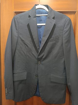 Traje de chaqueta y pantalón de la marca Cortefiel. - Color azul. - Diseño slim fit Americana de la talla 48 y pantalón de la talla 40 con el bajo arreglado para una altura de 1,80m (se puede sacar el bajo sin problemas). Esta nuevo, puesto de una vez. Nunca se ha llevado a la tintorería.
