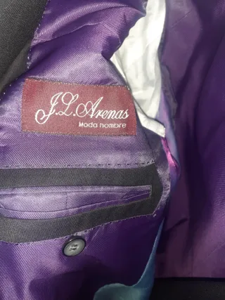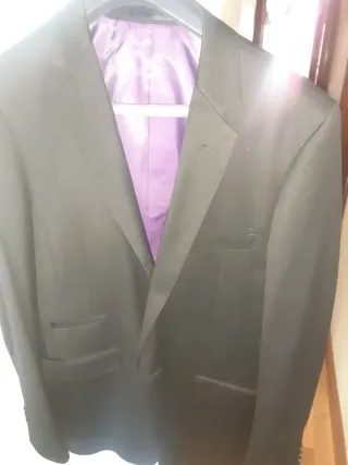 Elegante traje de hombre en color negro. El forro interior es de un llamativo color morado. Dos usos - Chaqueta con solapas clásicas. - Bolsillos frontales. - Cierre de un botón.