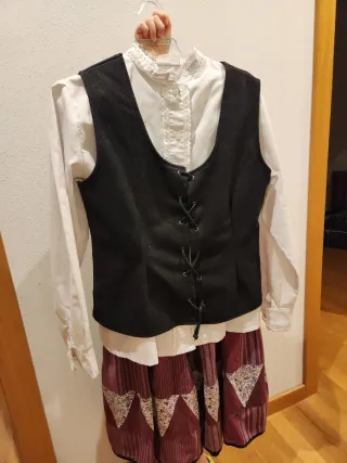 Traje de casera: - Blusa blanca con cuello y puños de encaje. (10€) - Chaleco negro con cordones. Talla 18. (30€) - Falda de tonos burdeos con detalles. Talla 16. (30€) Precio del conjunto: 60€. La falda y el chaleco están en perfectas condiciones. La camisa tiene más evidencias de desgaste.