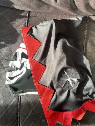 Máscara de lucha libre con diseño de calavera. - Detalle de borde en zig-zag rojo. - Diseño frontal de telaraña azul.
