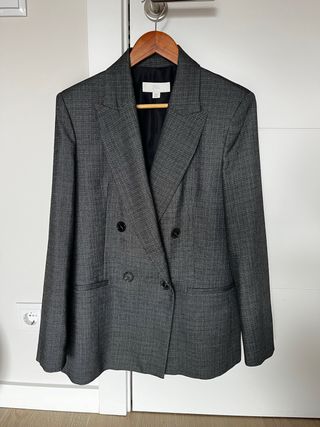 Elegante blazer de Zara, perfecto para cualquier ocasión. - Diseño de doble botonadura. - Cuello solapa clásico. - Bolsillos frontales. - Forro interior negro. - Color gris jaspeado
