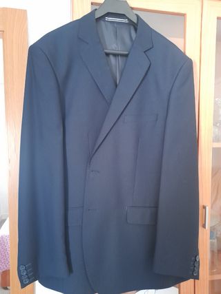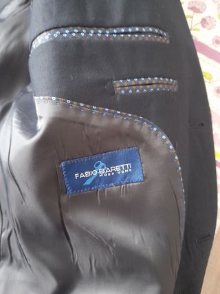 Traje de caballero, 1 puesta real. El color es el de las últimas fotos, azul oscuro. Marca Fabio Baretti. Talla 50/56 pantalón. Todas las medidas en las fotos (largo manga 22 cm, ancho hombros 19cm) preguntar si alguna duda. Composición: 50% poliester, 25% viscosa, 25% lana. Se entrega limpio de tintorería y en funda guardapolvos