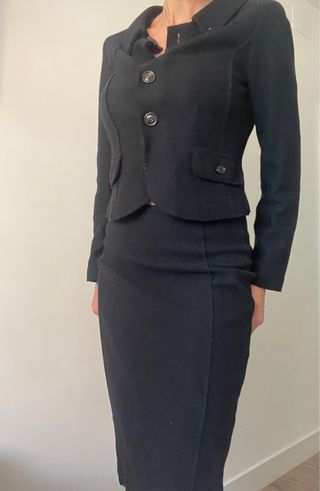 Conjunto de chaqueta y falda con un diseño elegante. - Chaqueta con solapas y cierre de botones. - Falda de corte recto. Talla tipo M-L Precio negociable en cada traje.