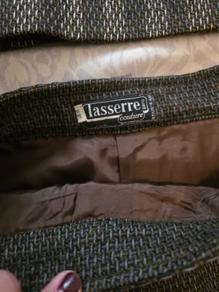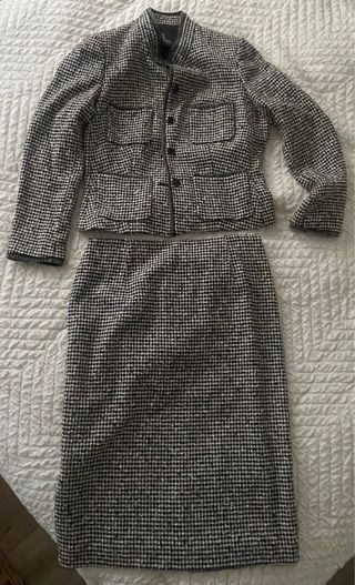 Conjunto de chaqueta y falda de la marca Lasserre. - Diseño de cuadros en blanco y negro. - Chaqueta con cuello mao y bolsillos frontales. - Falda de corte recto.