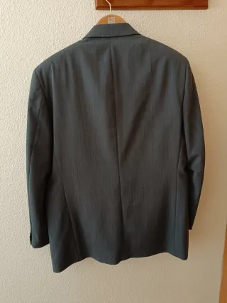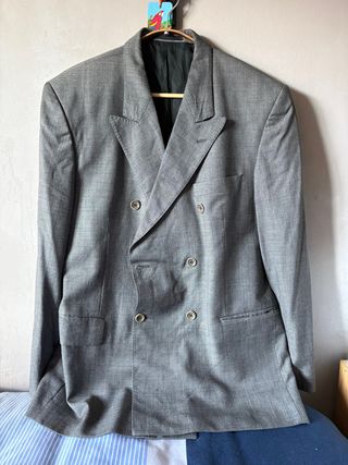 Elegante traje de dos piezas con un diseño clásico. - Chaqueta de doble botonadura. - Solapa de muesca. - Bolsillos frontales. - Puños con botones. En muy buenas condiciones, muy poco uso, precio negociable.