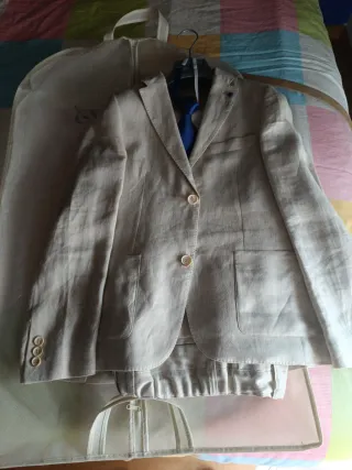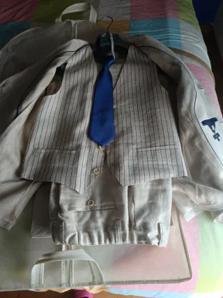 Conjunto de traje de lino en color beige, ideal para eventos o uso diario. Talla 14 - Chaqueta de lino con dos botones. - Pantalón de lino a juego. - Corbata azul incluida. -Chaleco -Camisa El bajo del pantalón está metido un poco