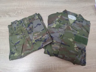 Traje con estampado pixelado en tonos verdes y marrones. Diseño de corte recto y cuello camisero. - Cierre frontal con botones. - Dos bolsillos en la parte frontal inferior. - Parche de velcro en la manga izquierda.