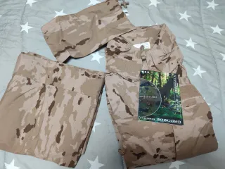 Traje de intemperie con estampado árido. - Diseño de camuflaje en tonos beige y marrón. - Cremallera frontal. - Cintura elástica con cordón. - Cierre de botón en la cintura - bolsa de transporte