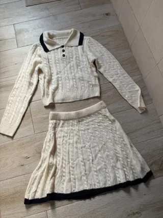 Conjunto de jersey y falda con tejido de punto trenzado. - Jersey de manga larga con cuello - Falda corta con vuelo - Detalle de canalé en puños y bajo