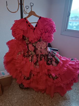 Traje de flamenca hecho a medida, sobre talla 38, la tela es de algodón y los ribetes de raso fucsia, con cremallera en la espalda. Escote de pico.