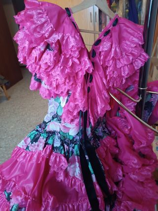 Precioso traje de Sevillanas, tanto para salir en fiestas de moros y cristianos o como divertiro disfraz para carnavales. Es un vestido alegre, vistoso y cómodo de llevar. - Diseño floral en tonos blancos y fucsia. - Varias capas de volantes. - Perfecto estado.