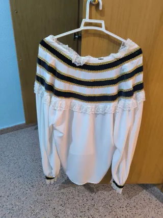 Traje de huertana en talla 5XL, con un diseño vibrante y colorido. - Prenda de talla 50-52 - Combinación de colores morado y multicolor con diseño de flores. - Largo de falda 100cm aprox Vendo el traje completo, compuesto de falda pañal, camisa, justillo, pico y manteleta. El precio es de 400€ sin mantilla, con mantilla negra de media luna serían 440€. Dispongo de espardeñas con cuña en color verde para el traje por 20€ más. El traje está en perfectas condiciones, utilizado una única vez. Cualquier duda, preguntame por mensaje y hablamos.