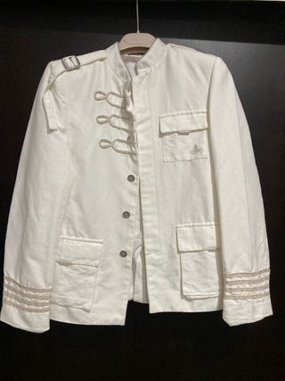 Elegante traje de comunión de Hortensia Maeso para niño en color crudo y tejido soft de mucha calidad tipo lino, muy cómodo. - Chaqueta con detalles militares. - Botones decorativos. - Bolsillos frontales. - Adornos en puños y cuello. Unico uso Camisa talla 8, pantalón talla 8, americana talla 10. Se incluyen también zapatos de yute, hechos en España talla 37.