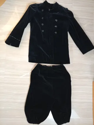 Conjunto de traje para niño de fiestas de moros y cristianos. Chaqueta con cuello alto y doble abotonadura. Pantalón con cintura elástica. Todo en terciopelo negro.