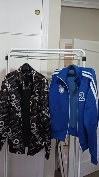 Conjunto de dos chaquetas, una estampada en negro y blanco y otra deportiva azul. - Chaqueta estampada con diseño de texto. - Chaqueta deportiva con detalles blancos en mangas y cuello. - Chaqueta azul con escudo y número 2.