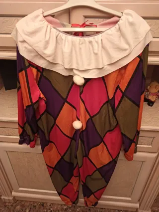 Divertido disfraz para señora de payaso. Talla M. Incluye: vestido de lunares con aro interior para dar volumen, chaquetilla con botones, gorro y pajarita. Solo ha sido utilizado en una ocasión y está en perfecto estado. Limpio y desinfectado. Listo para ser usado y divertirte en Carnaval o cualquier fiesta temática Disfraz divertido y colorido para carnaval o fiestas.
