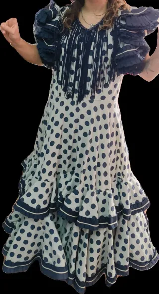 Traje de flamenca con un diseño clásico de lunares. - Mangas abullonadas con volantes. - Adornado con flecos en el escote. - Múltiples volantes en la falda.