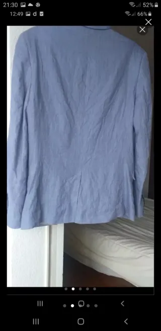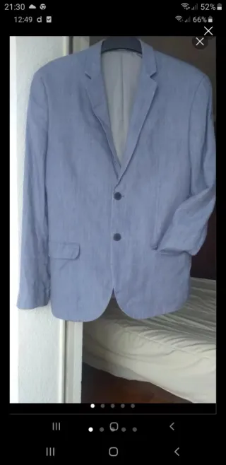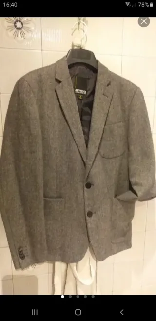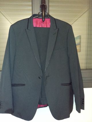 Puesto una vez para una graduación. El traje está IMPECABLE valió casi 300euros .El pantalón es una talla 46 y la americana talla 52. Aproximadamente persona de 1, 80 de altura y unos 78-80kg. ES UNA GANGA.