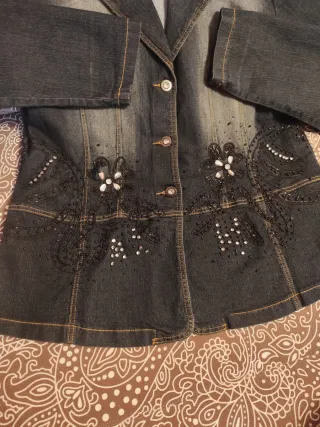 Traje pantalón chaqueta vaquero elástico , con pedrería en la chaqueta delante,botones metálicos con cristal .Pantalón con bolsillos atrás con botones y abajo del pantalón puntilla negra con pedreria