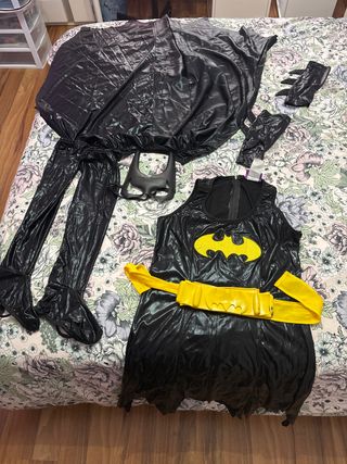 Disfraz de Batgirl para mujer, ideal para fiestas temáticas o Halloween. Incluye varios accesorios para completar el look. - Capa negra brillante. - Máscara negra. - Cinturón amarillo con logo de murciélago. - Guantes negros con detalles. - Vestido negro con logo de murciélago amarillo.