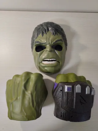 Pack de máscara y guantes inspirados en Hulk. - Máscara con detalles faciales y articulada. - Guante izquierdo de gran tamaño. - Guante derecho con detalles tecnológicos y hace ruido al golpear.
