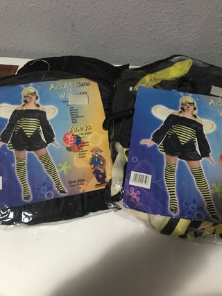 Dos disfraces de abeja para mujer, talla única. Incluye varias piezas para completar el look. Usados una sola vez. No lleva peluca. Se venden juntos o separados. 23€ los dos x separado 10€ cada uno. - Top - Shorts - Calcetines - Alas -Cinturón