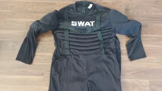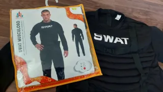 Disfraz de SWAT para adulto, talla L. Incluye mono y cinturón. - Mono negro con SWAT en blanco, músculos y cremallera en la espalda. - Diseño inspirado en uniformes tácticos. - Incluye metralleta, porra y casco de Swat.