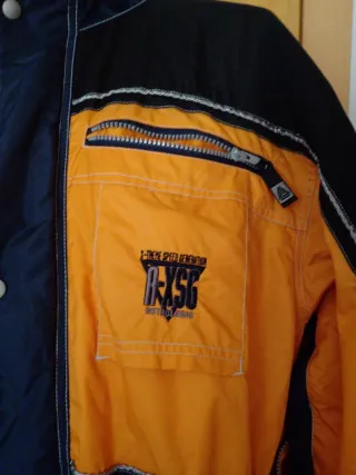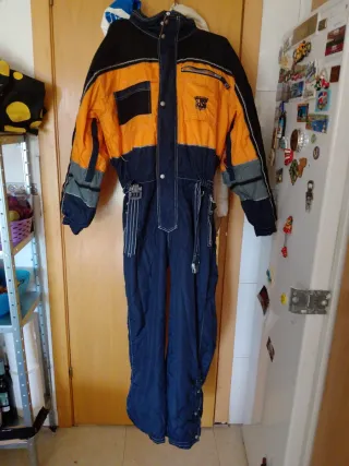 Traje de esquí de una pieza de la marca Astrolabio, ideal para disfrutar de la nieve. - Combinación de colores azul y naranja. - Cierre frontal con cremallera y botones. - Bolsillos en la parte superior y en las piernas. - Cinturón ajustable con hebillas.