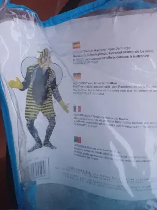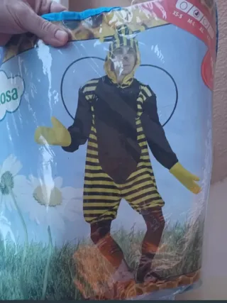 Disfraz de avispa para adulto, usado una sola vez. Ideal para fiestas o eventos. - Diseño de rayas amarillas y negras. - Incluye capucha y guantes. - Talla M (equivalente a 38-40 / 48-50).