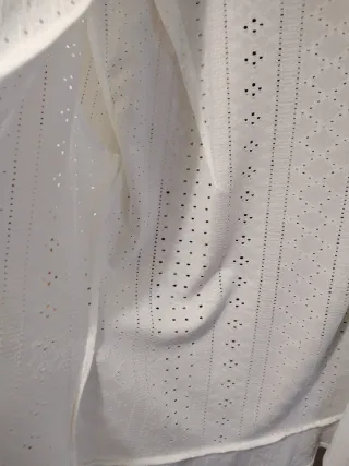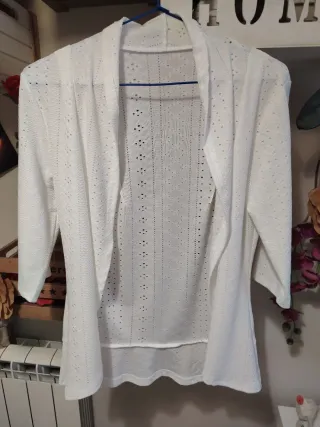 Chaqueta de punto calado en color blanco. Es una prenda ligera y transpirable, ideal para añadir un toque especial a cualquier atuendo. Talla única equivale a una talla S. - Diseño de rejilla con motivos. - Manga tres cuartos. - Corte abierto.