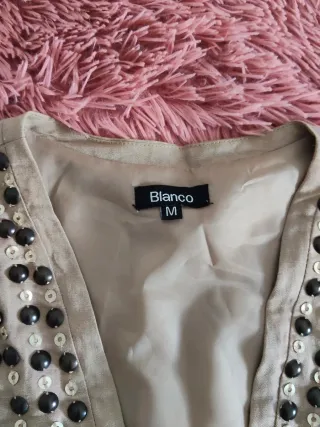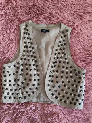 Chaleco de vestir con un diseño moderno y detalles de tachas. La espalda es lisa,no tiene tachas - Color beige con tachas negras y plateadas. - Corte abierto y corto. - Talla M