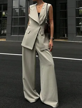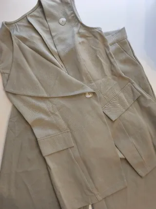 Conjunto de dos piezas formado por un chaleco de vestir y un pantalón de pierna ancha. - Chaleco con solapa y cierre de botón. - Pantalón de corte recto y fluido. - Diseño moderno y elegante. Totalmente nuevo y elegante, super cómodo. No tiene ninguna puesta ni desperfecto. Lo vendo porque mido 172cm y me queda un poco corto, me faltan 3-4 cm, pero tiene una calidad increíble y es precioso. Me comprometo a que si no te convence lo vuelvo a aceptar de vuelta sin problema.