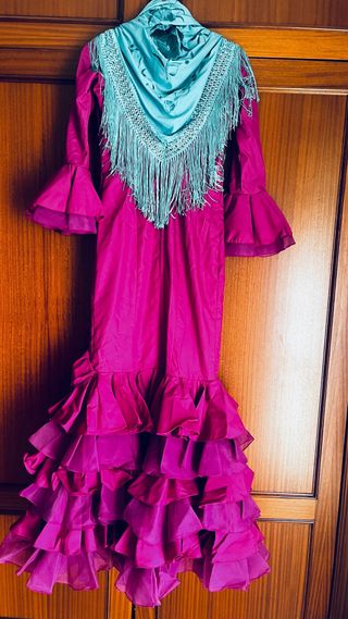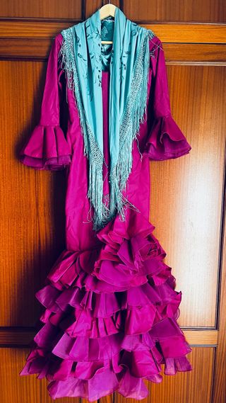 Traje de flamenca con un diseño vibrante y lleno de movimiento. Perfecto para ferias. - Mangas acampanadas con volantes. - Falda con múltiples volantes escalonados. - Incluye chal a juego con flecos. Talla 38. Altura 168cm y peso 55 kg.
