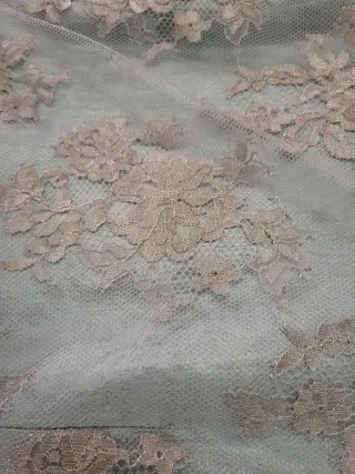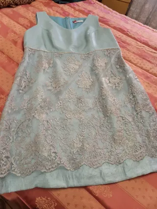 Elegante traje de fiesta en tonos azul y plateado, ideal para eventos especiales. Diseñado para un ajuste cómodo y favorecedor. - Detalle de pedrería en la cintura. - Encaje floral sobre tela satinada. - Bajo con acabado festoneado.