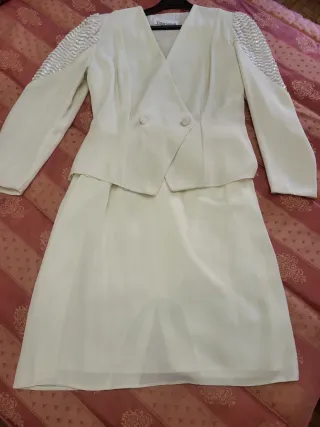 Elegante traje de falda de la marca Cortefiel, en color beige y talla XXXL (46/18). El conjunto incluye una chaqueta y una falda. Falda recta forrada con abertura trasera Chaqueta bolsillos laterales, 4 botones, está forrada. Buenas calidad. Puedes llevar el conjunto por separado. Mira en mi perfil tengo más ropa, libros.... - Tejido de textura discreta. - Diseño clásico y atemporal. - Perfecto para ocasiones especiales o el día a día.