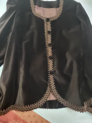 Elegante traje de tres piezas, ideal para eventos especiales. - chaqueta a juego de sube terciopelo en marrón. - Parte superior con detalles de encaje dorado. - Falda larga de terciopelo marrón.